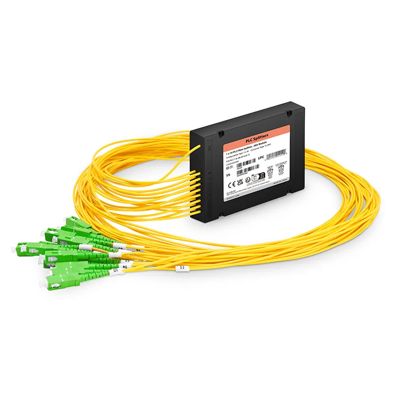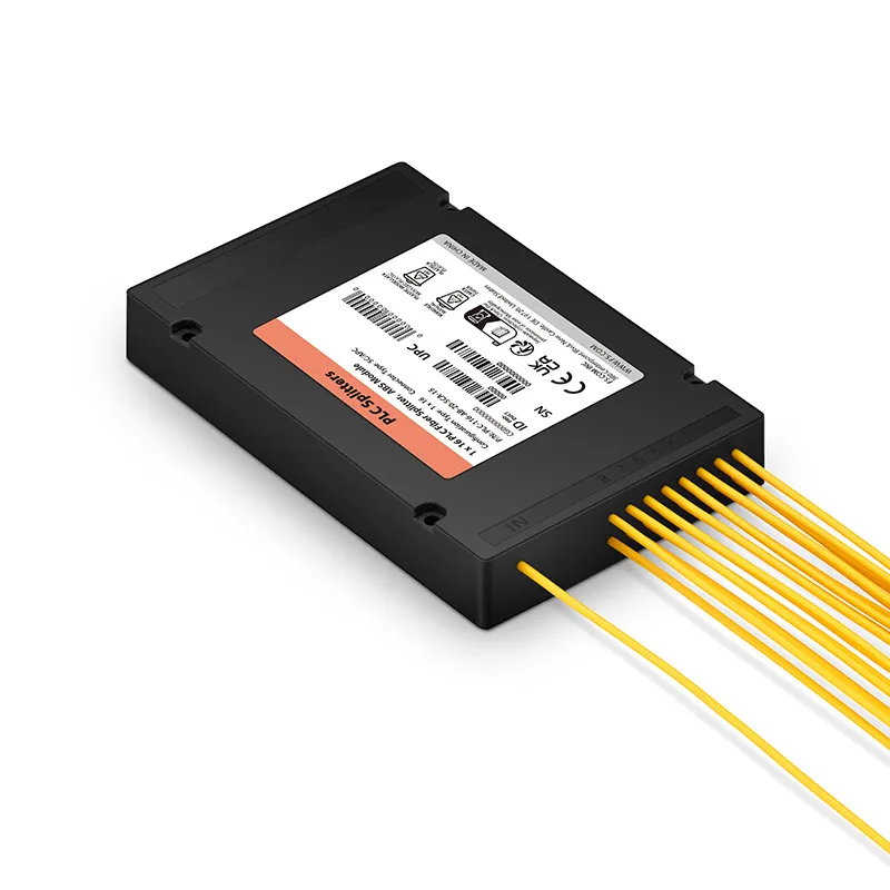 This 1x16 PLC fiber optic splitter features a compact and durable ABS enclosure with SC/APC connectors and 2.0mm pigtails. Designed for reliable optical signal distribution in fiber access networks, it supports **single-mode G652D and G657A** fibers, making it ideal for FTTH, CATV, and PON deployments.