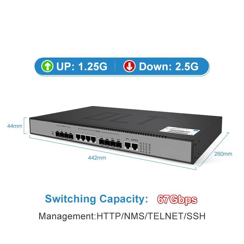 - Symmetric/Asymmetric Rates: Compliant with ITU-T G.984 standards, offering 2.488 Gbps downstream and 1.244 Gbps upstream per PON port.