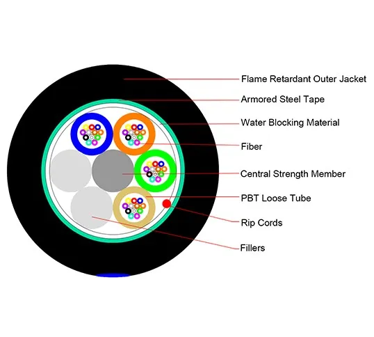GYTZA type optical cable places 250 μm optical fiber in a loose sleeve made of high modulus plastic, the sleeve is filled with waterproof filler, the center is steel wire as a metal reinforcement, and the high-core cable is sometimes coated with PE. The sleeve and filler are twisted around the reinforcement to form a compact circular cable core. The cable core is covered with PSP and filled with waterproof filler. Finally, the flame-retardant PE sheath is used to form the cable.