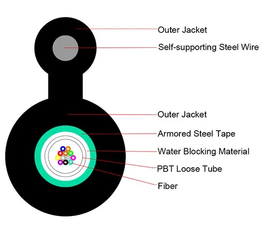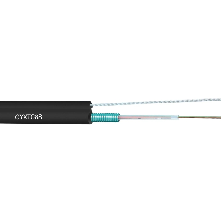 GYXTC-8S type optical cable, the center of the optical cable is made of high modulus plastic loose tube, the optical cable core is composed of 2-24 loose tubes, the support part of the optical cable is composed of multiple strands of stranded wire, and the support part is made of polyethylene (PE) sheath to form an 8-shaped structure. The loose tube has high strength and is resistant to hydrolysis. GYXTC8S is an ideal self-supporting outdoor optical cable, suitable for overhead installation.